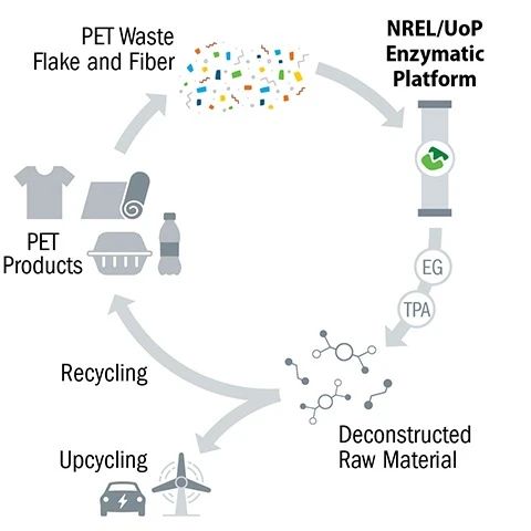 NREL Üniversitesi ve UoP'deki bilim insanları, tüketici sonrası PET'i hızlı bir şekilde aynı kimyasal yapı bloklarına, tereftalik asit (TPA) ve etilen glikole (EG) parçalayabilen, uygun maliyetli, çevre dostu bir enzimatik platform geliştirdi.